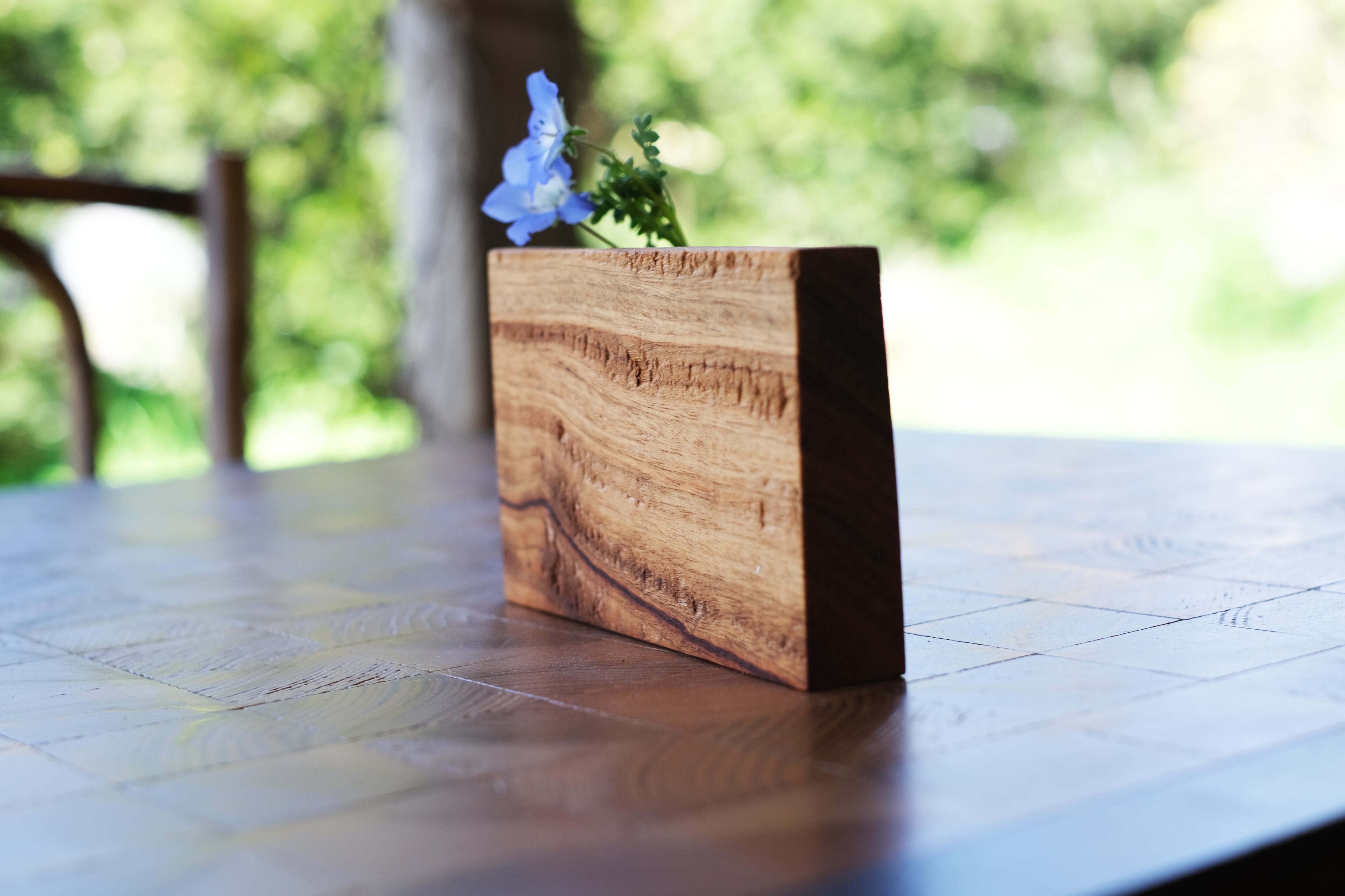 私が使用している木材はすべて廃材です。家を支えていた木材は、歳月を経て趣があります。星野道夫の旅する木のように、花や絵を生けるために生まれ変わってもらいました。ありがとう。傷や節、色あせた木目が異なる、世界にたった一つの廃材作品です。