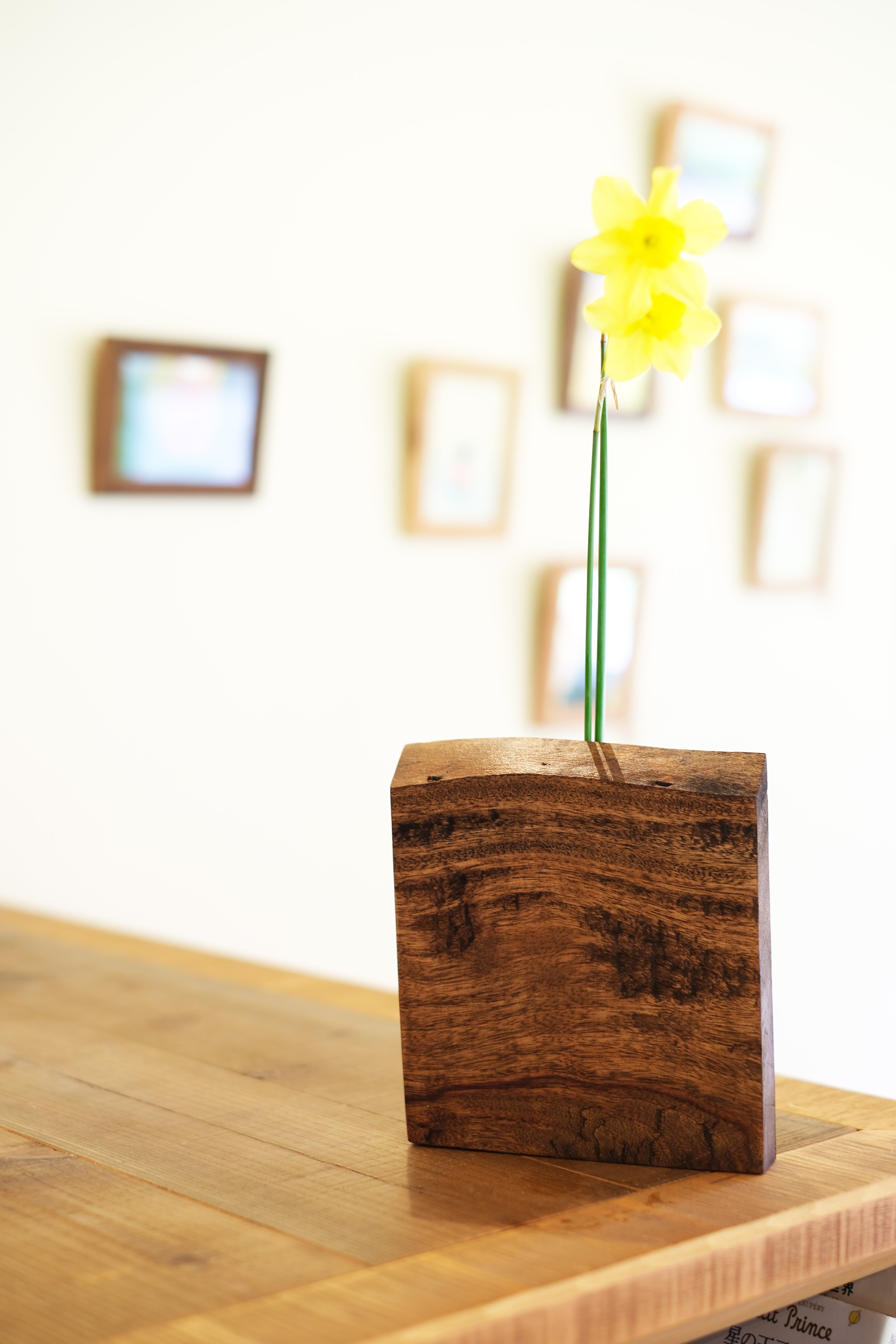 私が使用している木材はすべて廃材です。家を支えていた木材は、歳月を経て趣があります。星野道夫の旅する木のように、花や絵を生けるために生まれ変わってもらいました。ありがとう。傷や節、色あせた木目が異なる、世界にたった一つの廃材作品です。