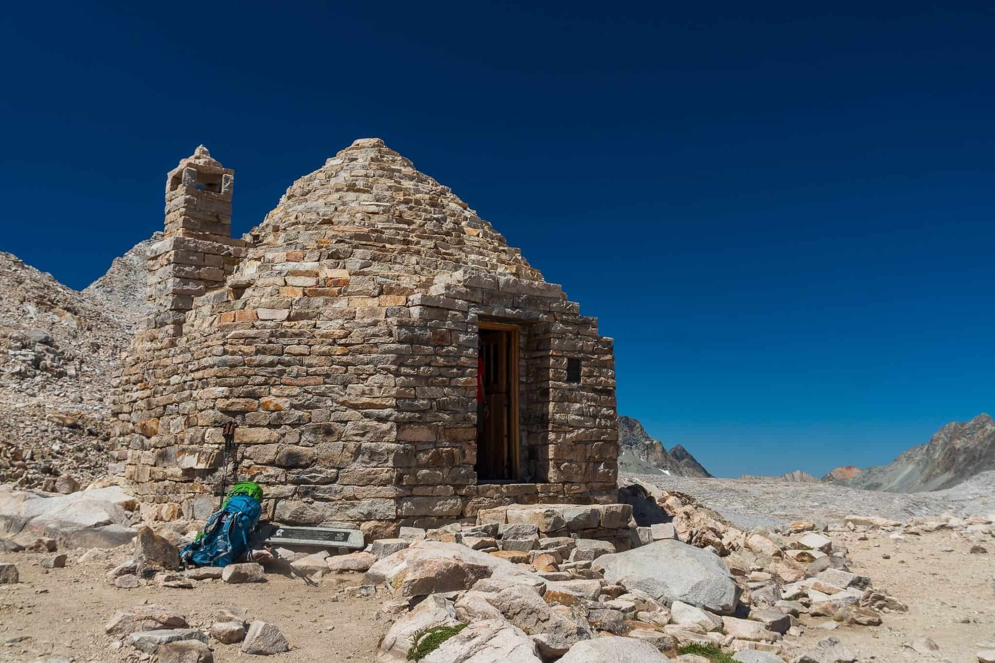 この地図の中心には、「ミュア・ハット(Muir hut)」という建築物があります(写真二枚目)。シエラネバダの自然保護運動を進めたジョン・ミューアに敬意を表して作られました。建設をしたのは、自然を守り愛したシエラクラブの会員たちです。標高3643mの険しい荒野の中で、ひとつひとつ石を積み上げて作られたそう。今ではJMTの象徴として、訪れる人々に避難小屋として使われています。